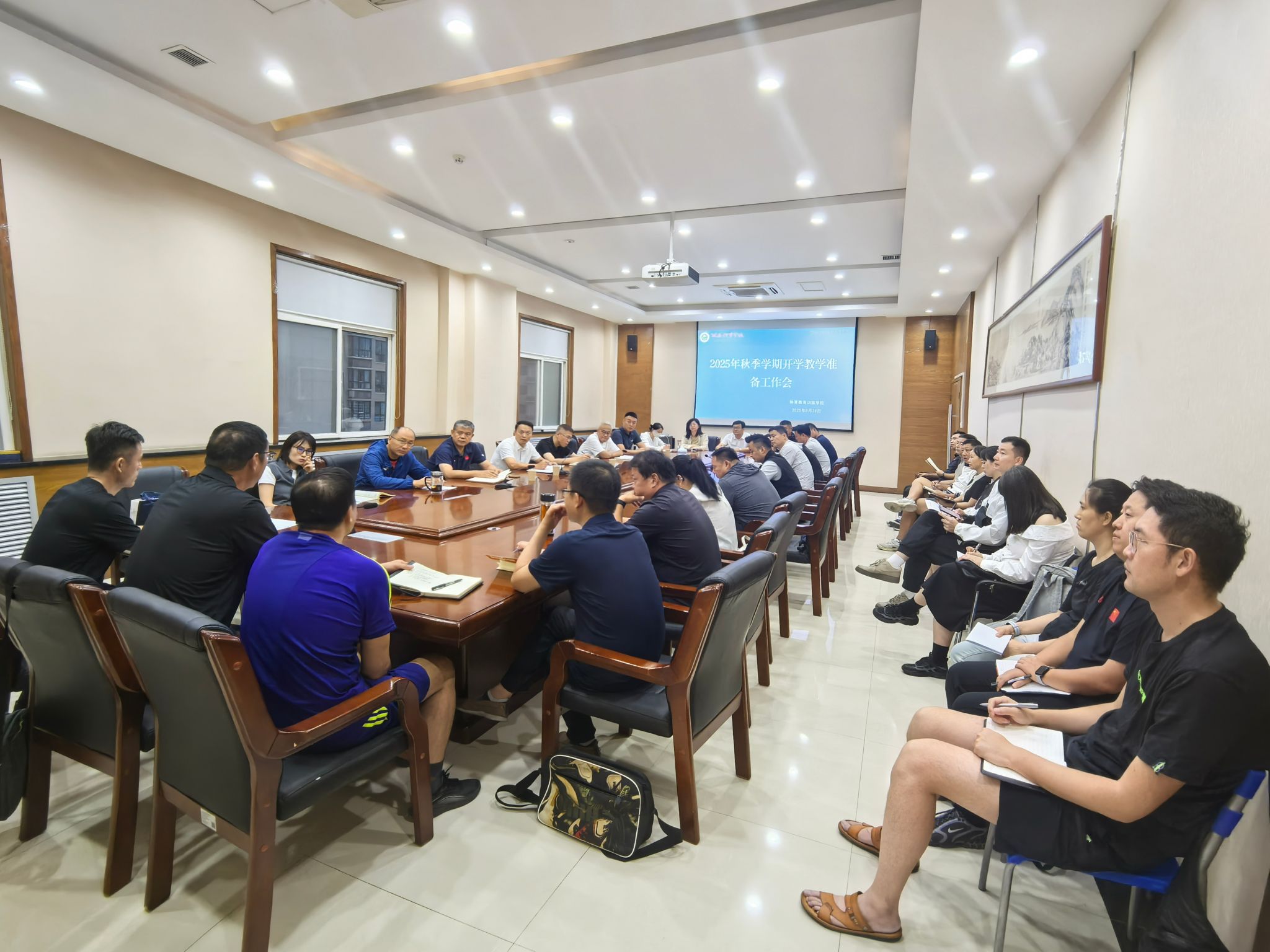 为全面统筹新学期教育教学工作,确保新学期开学各项教学工作平稳有序,8月28日晚,体育教育训练学院在含光校区二号行政楼1号会议室,召开了四个学院合并后首次秋季教学准备工作会议。校党委副书记、体育教育训练学院院长马海涛出席,学院领导班子、办公室成员、教研室主任、书记及各年级主任参加了会议。