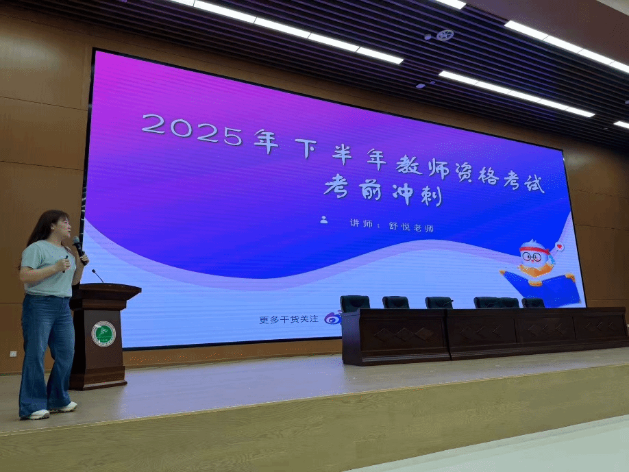 为提高体育教育、特殊教育专业学生教师资格考试笔试通过率,明晰备考重点、突破复习难点。9月10日下午,体育教育专业2023级年级负责人徐起、辅导员胡雪娇老师联同特殊教育专业耿莉老师在图书馆三楼报告厅举办教师资格考试考前冲刺培训讲座。本次讲座邀请粉笔教育舒悦老师主讲,全体无课学生参加本次活动。