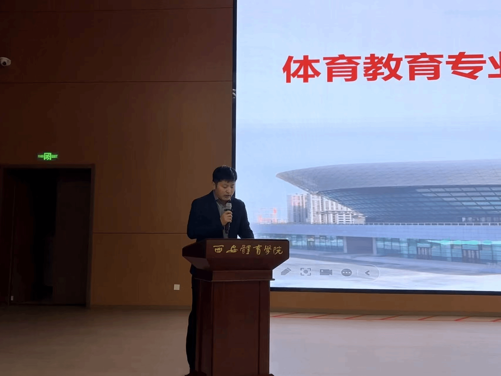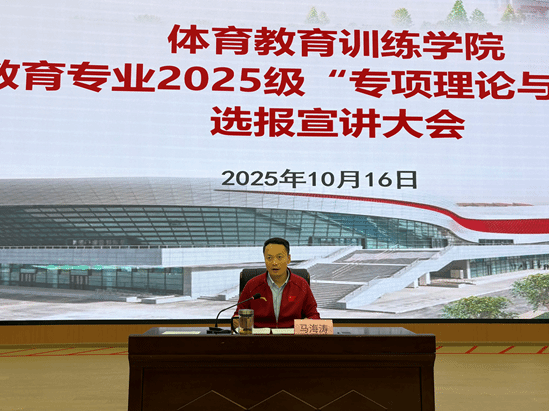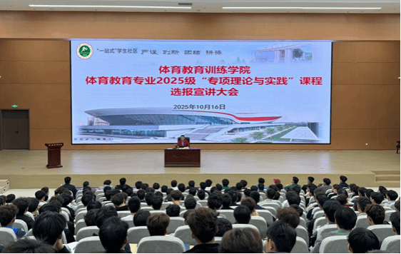 10月16日晚,体育教育专业2025级“专项理论与实践”课程选报宣讲大会在鄠邑校区报告厅召开。本次大会特邀校党委副书记、体育教育训练学院院长、体育教育专业学科负责人马海涛出席,年级辅导员张佳怡及全体学生参加,会议由年级负责人张远主持。