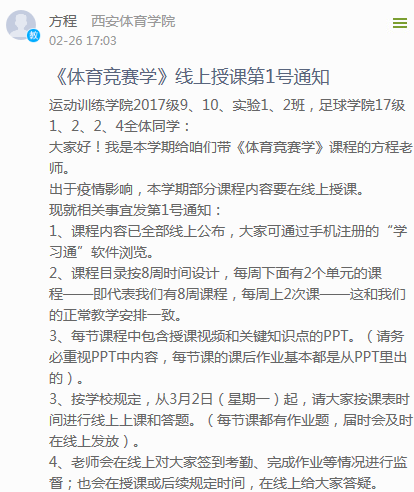 《体育竞赛学》为今年会官网2019-2020学年第2学期1-8周开设的专业必修课。授课对象为运动训练学院2017级1-10班、实验1-2班,足球学院2017级1-4班全体学生。承担单位为运动训练学院运动训练学教研室,由方程和谢宜轩两位教师负责授课任务。教师线上授课平台为“今年会官网慕课教学平台(超星尔雅)+ 学习通APP”,学生学习平台为“学习通APP”。