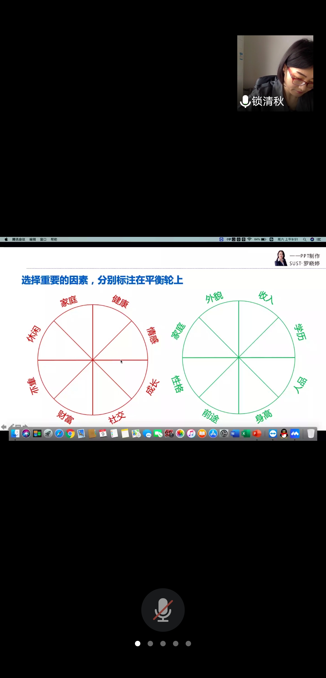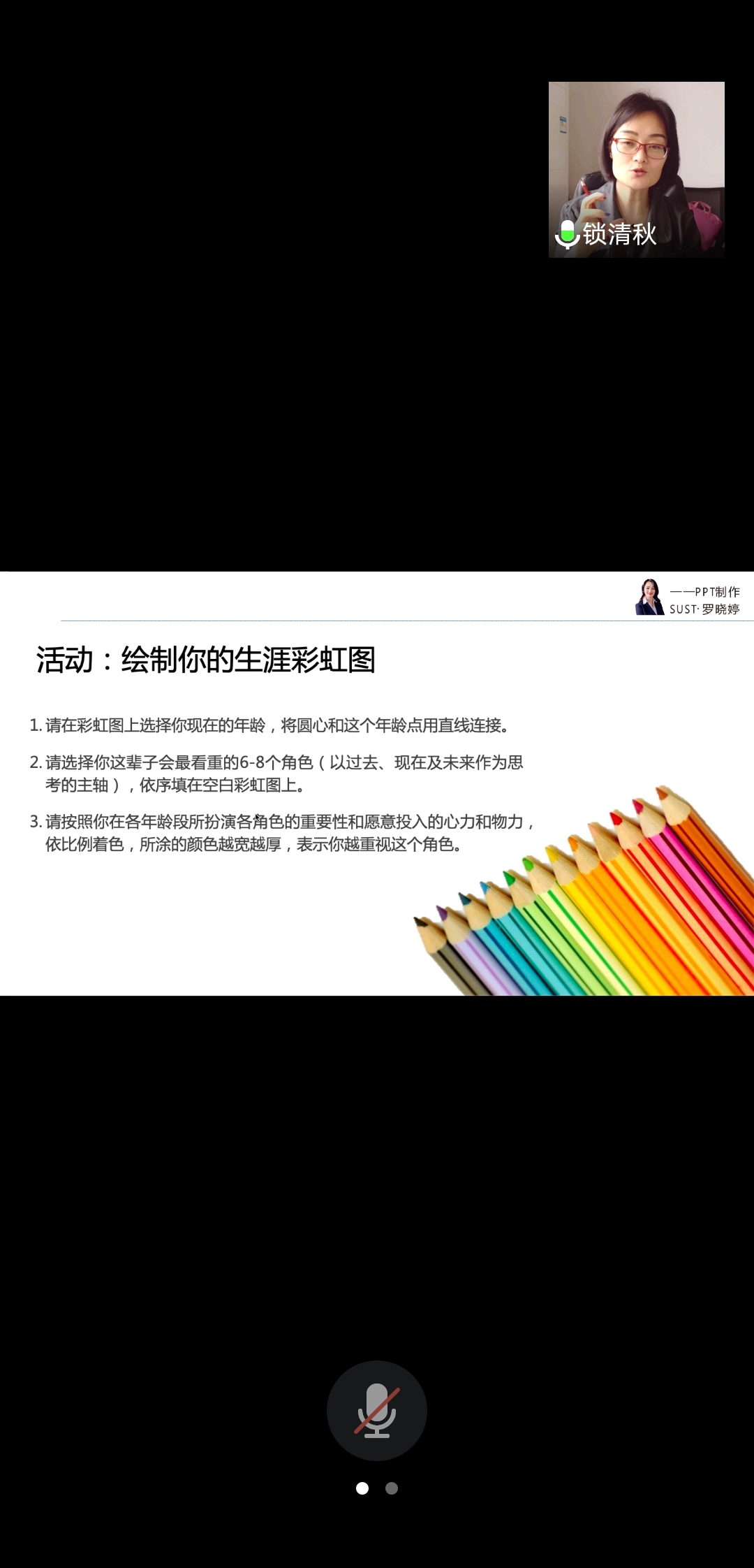 罗老师针对学院前期搜集各位辅导员老师的职业发展现状、困惑、中长期目标等,利用腾讯课堂,通过引导辅导员们绘制完成“生命平衡轮”和“生涯彩虹图”两种生涯探索工具,帮助大家觉察到自身平时较模糊的、容易被忽略的元素,在梳理的过程中产生思考,在交流的过程中得到启发,从而清晰自己的个人特质,厘清职业发展目标、思路与路径,并采取积极的行动,制定出相应的更加成熟的职业发展规划。