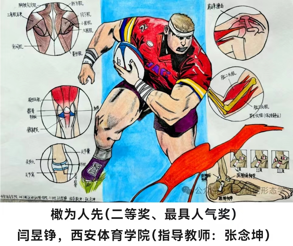 2024年5月13日,由高等学校国家级实验教学示范中心联席会基础医学组,及下属高等学校医学插图艺术创作联盟主办,北京体育大学团委、北京体育大学运动人体科学学院承办的“首届全国高等院校体育类大学生运动解剖学绘图作品在线展示”比赛,在北京体育大学运动机能形态学平台召集人员参加。赛事通过宣传征集后,全国诸多体育类高校和在校大学生、研究生积极响应,踊跃参加。经初筛评审共60幅优秀作品入围,6月5日,经评审组制定实施细则后,专家单独评分、汇总评议。拟定一等奖(6幅)、二等奖(12幅)、三等奖(18幅)和最具人气奖10名。我院2023级闫昱铮同学的作品《橄为人先》荣获二等奖、“最具人气奖”。