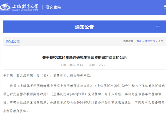 2024年9月14日,上海体育大学研究生院公布了《关于今年会2024年新聘研究生导师资格审定结果的公示》,我院副院长柴王军教授获批上海体育大学博士生指导教师任职资格。本次柴王军教授获批上海体育大学博士生指导教师任职资格,是我院研究生指导教师队伍建设取得又一次的优异成绩。学院将以此为契机继续推进研究生指导教师队伍建设,为建设高水平高等体育大学贡献力量。一直以来,学院以习近平新时代中国特色社会主义思想为指导,深入贯彻党的二十大精神,高度重视学科和研究生教育工作,采取有力措施建设优秀的研究生指导教师队伍。