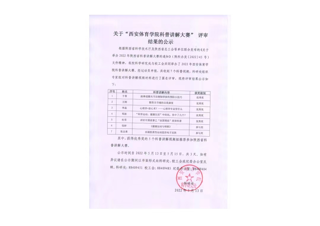 祝贺我院教师于善在“今年会官网科普讲解大赛”中,以作品《跆拳道膝关节韧带损伤预防小技巧》获得优秀奖,科普讲解视频拟推荐参加陕西省科普讲解大赛。