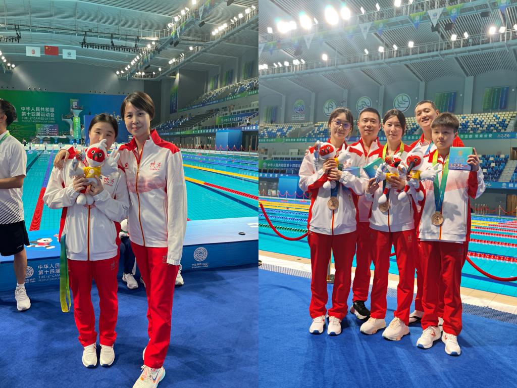 十四运会,我院共有80余名运动员分别代表陕西、河南、辽宁、广东、贵州、宁夏、云南、重庆、甘肃、内蒙古、山西、福建、四川等多个省市参加比赛,他们顽强拼搏,笑傲赛场,共取得了2金4铜多个前八名的优异成绩。其中马丽、殷腊梅、万金玉、吴全明代表陕西夺得了竞走女子20KM团体冠军;李兴富、李勇欣代表云南夺得了竞走男子20KM团体冠军;司雅杰、贾东瑾、蒋蕊旭、贺昕琪、王壹代表陕西取得了女子跳水团体铜牌;江一峣代表陕西取得了男子跳水团体铜牌;阿古得木代表内蒙古获得了柔道团体铜牌;赛日克.托了吾塔衣代表陕西取得了拳击铜牌。另有40余人分别取得了前八名。
