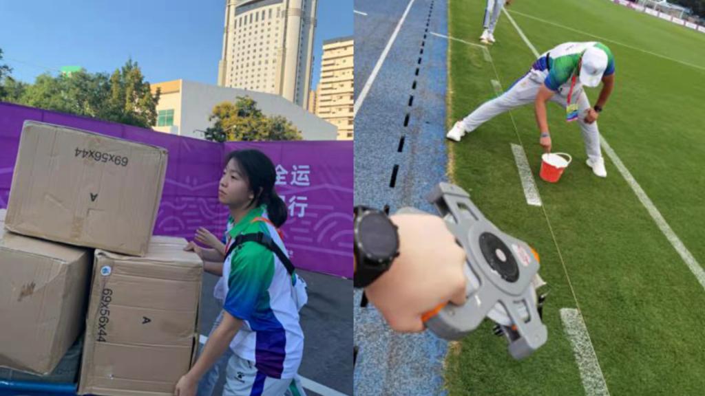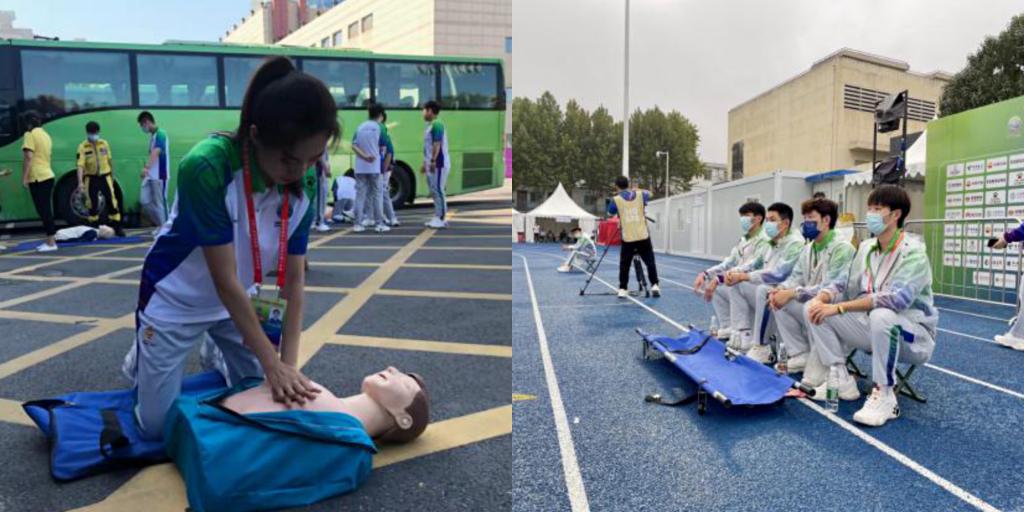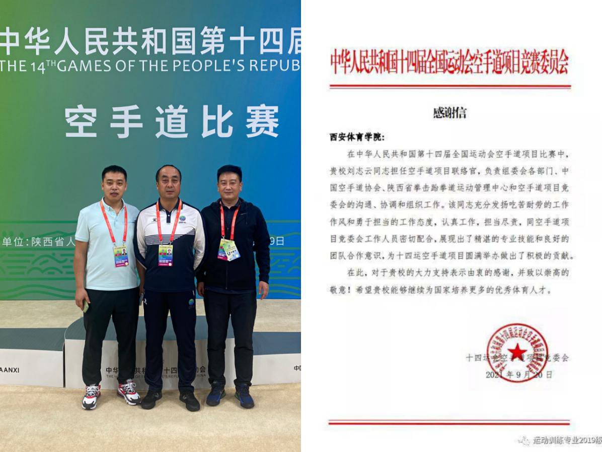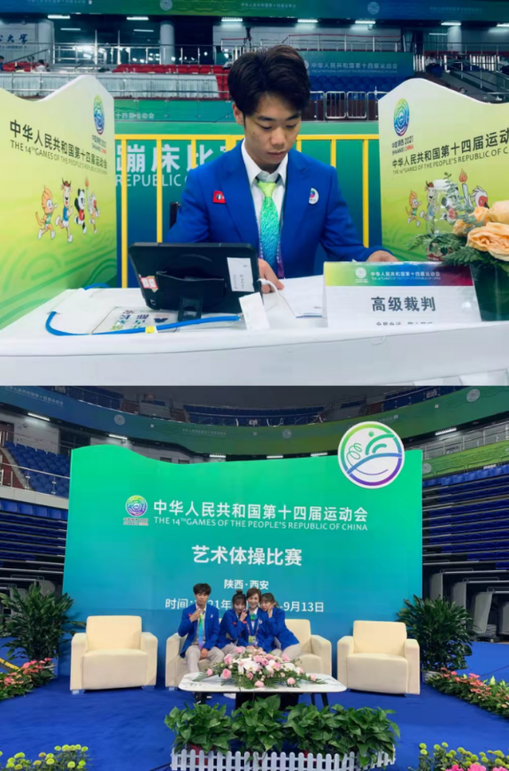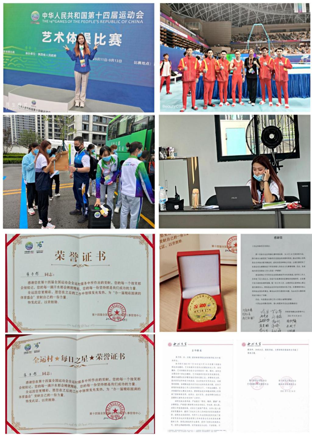 我院张佩莉、郑峰、于昕、黄环、张龙、王伟、南海涛、刘志云等20余名师生分别在手球、曲棍球、棒球、垒球、橄榄球、蹦床、游泳、田径、空手道等项目竞委会担任不同的岗位,他们坚守岗位,履职尽责,圆满的完成了比赛任务,受到了各项目竞委会的一致好评。学院辅导员南海涛是棒球竞委会驻村联络员,积极与村委会、棒球竞委会沟通协调,保障参赛队伍各项需求,为运动员取得好成绩贡献自己的力量,被全运村授予“敬业之星”荣誉称号;2019级学生朱子彤,在第十四届全国运动会蹦床、艺术体操项目竞委会竞赛组织处工作,担任蹦床、艺术体操竞委会驻全运村联络员一职,该同志奉献精神强,封闭食宿在全运村,不讲困难、不提条件、加班加点、默默奉献,利用个人专业优势出色的完成了技术官员在全运村的服务保障工作和竞委会交办的其他竞赛组织工作,体现出极佳的专业素养,获得了竞委会和全运村的高度认可,被全运村授予“党员保赛模范岗和每日之星”荣誉称号;学院党政办公室副主任刘志云,在十四运会担任空手道项目联络官,他尽职尽责,勇于担当,积极与组委会、中国空手道协会、省拳跆中心及项目竞委会沟通协调,同空手道项目竞委会工作人员密切配合,为十四运空手道项目圆满举办做出了积极的贡献,受到了空手道项目竞委会的感谢。