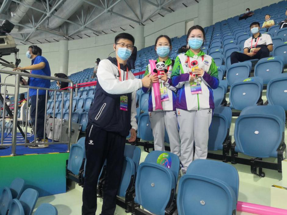 左一运训20级12班贺盺琪 跳水女子团体第三名 左1运20级12班王壹 跳水女子团体第三名
