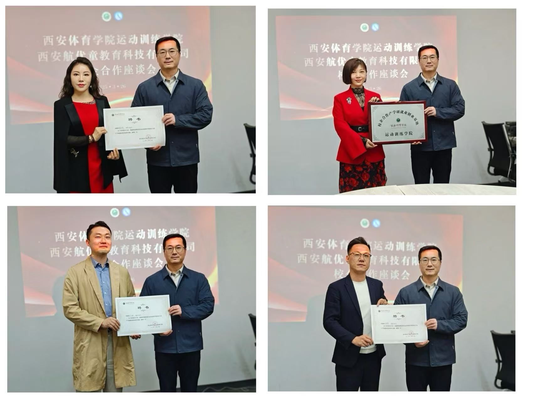 在随后的两天里,学院领导一行还分别走访了西安市篮排网运动管理中心、西京职业高级中学和同为体育人运动训练中心。通过与各方深入交流,学院不仅了解了当前体育行业对人才的需求趋势,还就校企合作、人才培养、就业实习等方面达成了多项共识。同时,学院还与这三家单位签订了"教育实习基地"合作协议,并举行了授牌仪式。此外,学院还向企业负责人颁发了"校企合作产学研就业创业校外导师"聘书,以进一步推动产学研深度融合。