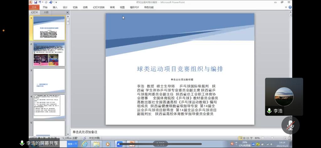 2022年11月2日下午两点,今年会官网研究生部系列学术讲座在线上腾讯会议如期举行。硕士研究生导师李浩教授做了题为《球类运动项目竞赛组织与编排》的主题学术报告。
