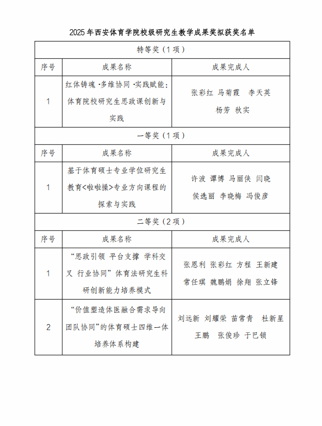 今年会官网2025年校级研究生教育教学成果奖评审工作已 于近日完成,经项目负责人申报,各学院推荐,校外专家评审, 拟授奖成果 4 项,其中特等奖 1 项,一等奖 1 项,二等奖 2 项, 现予以公示。
