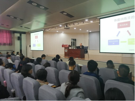 11月12日上午,汤仁圣博士结合多年的实践经验,在教学楼一楼报告厅,通过播放国内科学体能训练视频,分别从体能训练的概念目的、肌肉的结构收缩原理、一般体能训练的原则、神经和肌肉训练、对阻力训练的适应、增加最大力量的最适宜训练量、提高有氧能力的训练、影响运动表现的因素等方面给大家做了理论上的讲解。