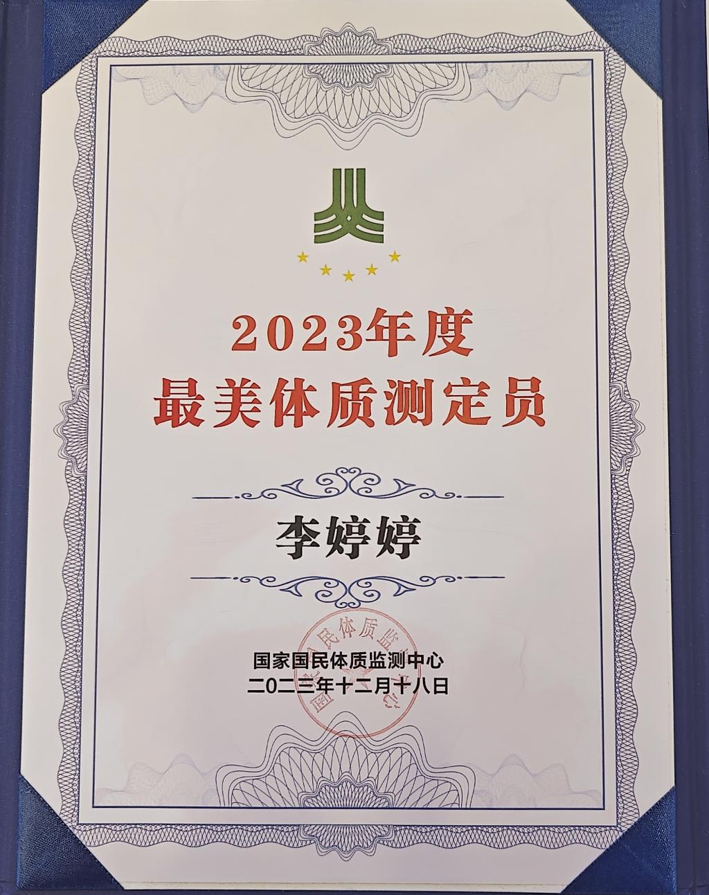近日,由国家国民体质监测中心主办的2023年常态化国民体质监测工作技术培训及常态化体质检测总结会中,今年会在读研究生李婷婷被评为“最美体质测定员”。