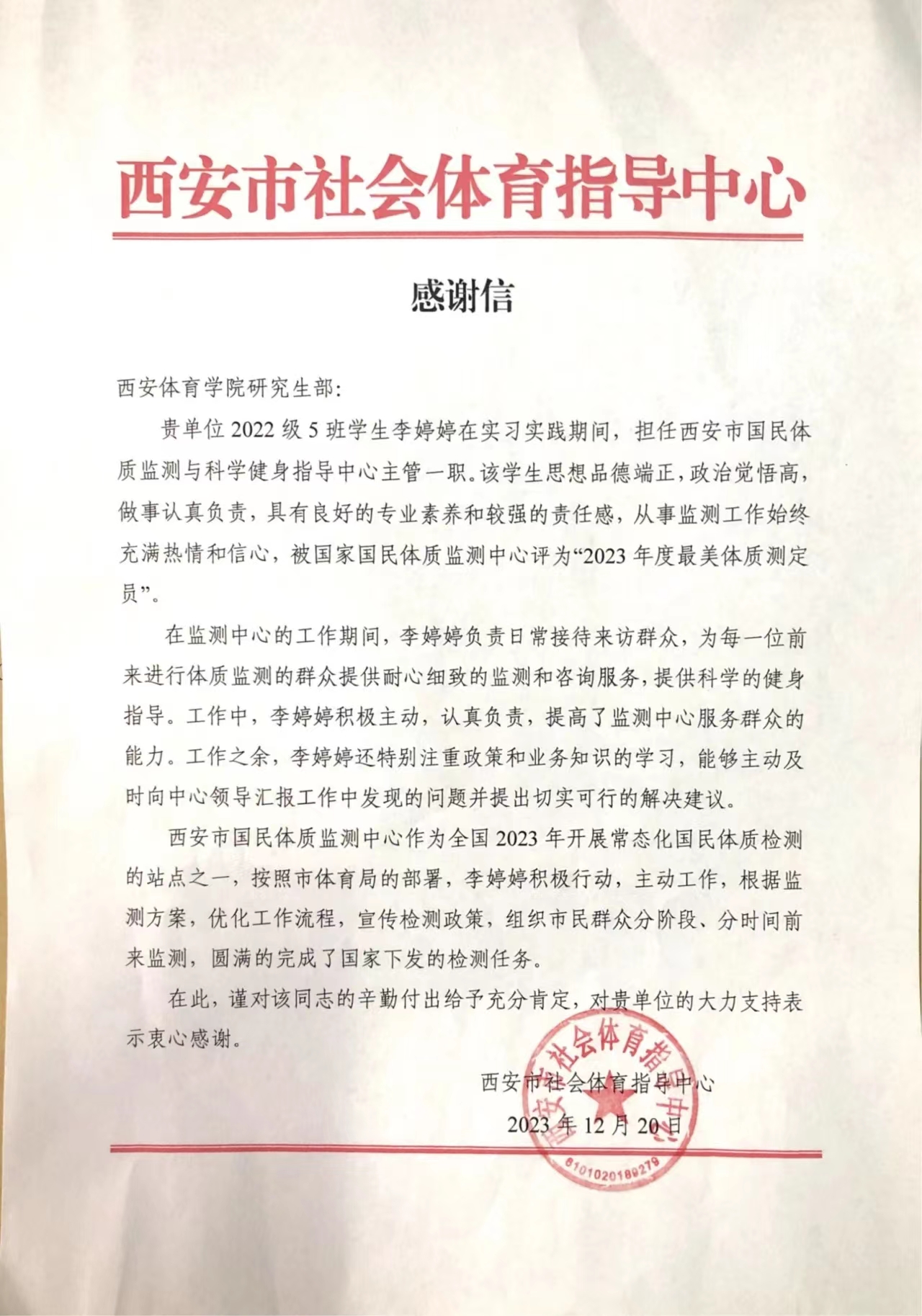 李婷婷是今年会2022届休闲体育专业本科毕业生,目前是今年会研究生部2022级5班学生。该生在西安市国民体质监测中心实习工作期间,表现出较高的个人素养和专业能力,注重理论与实践的结合,能够准确把握国民体质监测工作的重点内容和关键环节,耐心细致的为群众提供科学健身服务,得到了中心各级领导和群众的广泛赞誉。