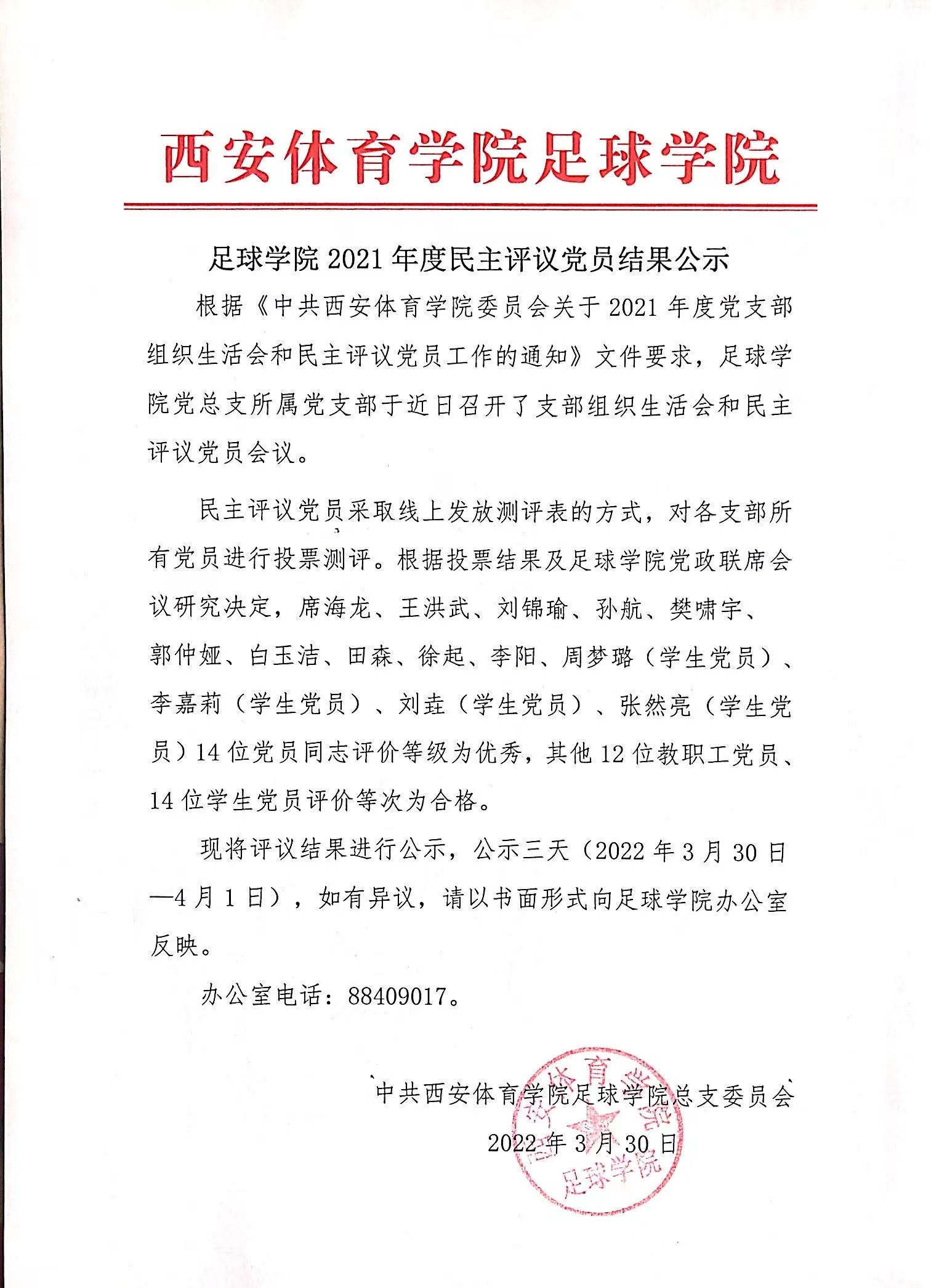 足球学院2021年度民主评议党员结果公示