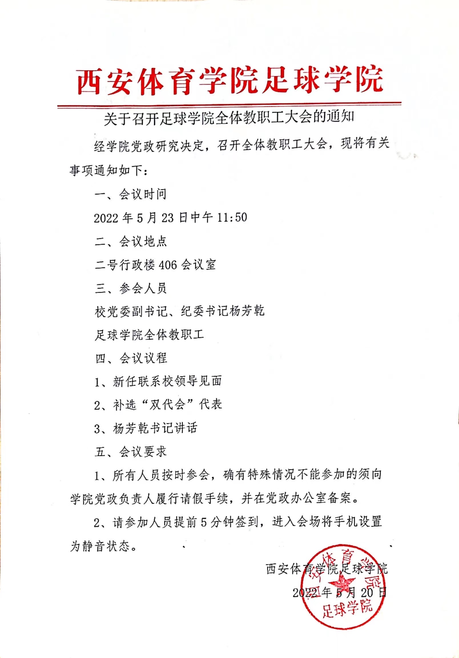 关于召开足球学院全体教职工大会的通知