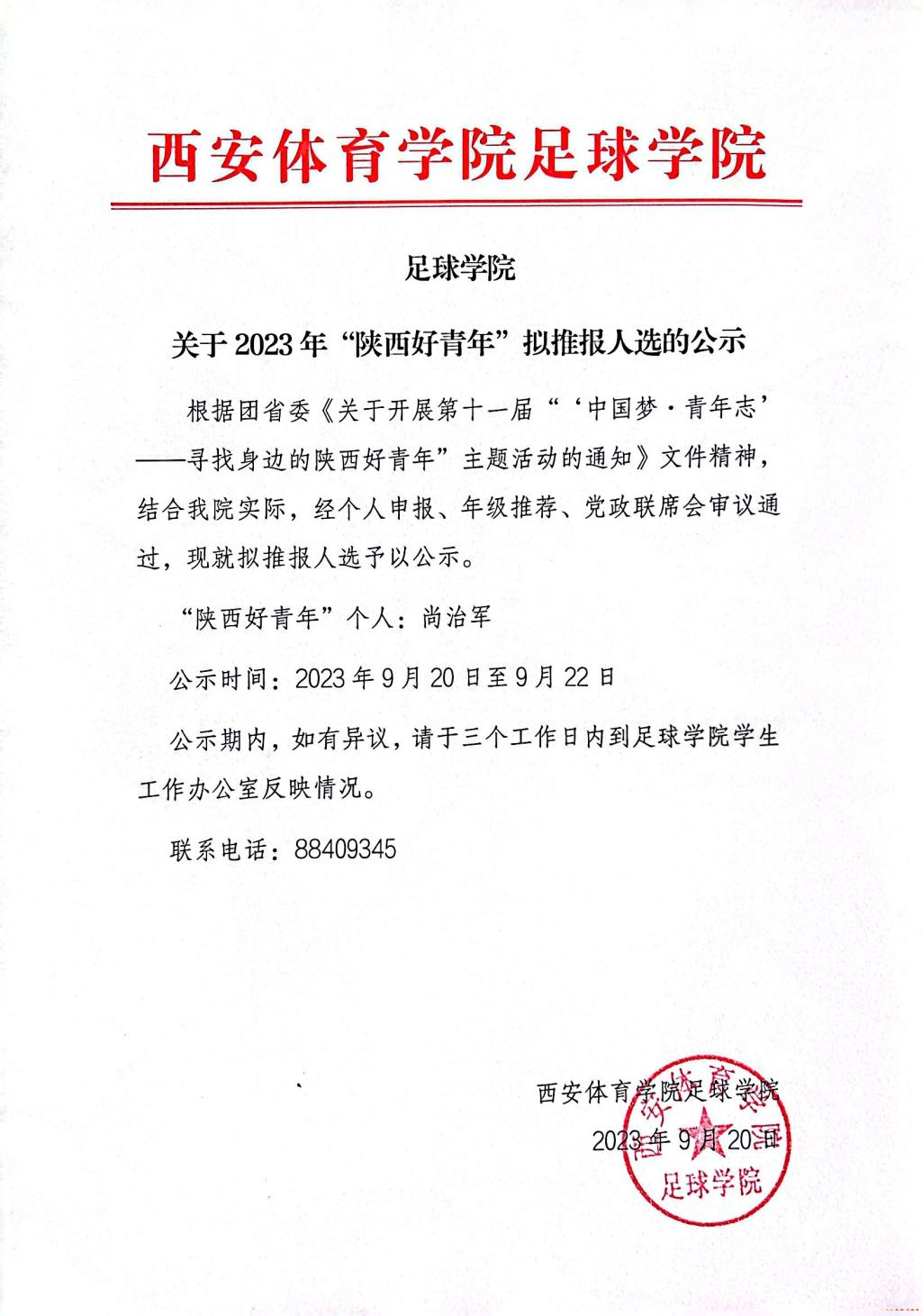 足球学院关于2023年“陕西好青年”拟推报人选公示
