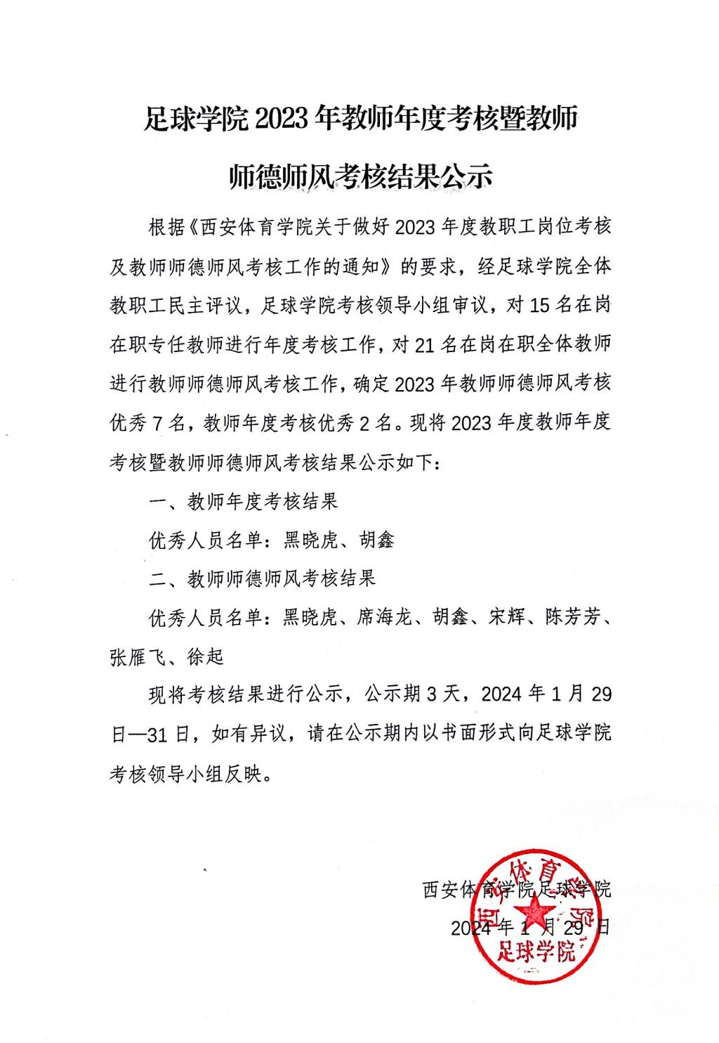 足球学院2023年教师年度考核暨教师师德师风考核结果公示