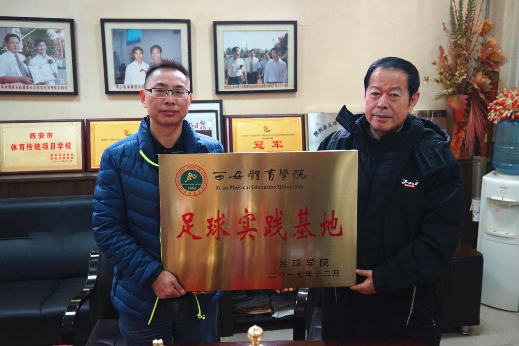 12月26日,足球学院院长朱军和2017级辅导员南腾赴陕西师范大学附属中学,双方共同签署了“足球教学实践基地”协议,朱军院长向陕西师范大学附属中学授牌。