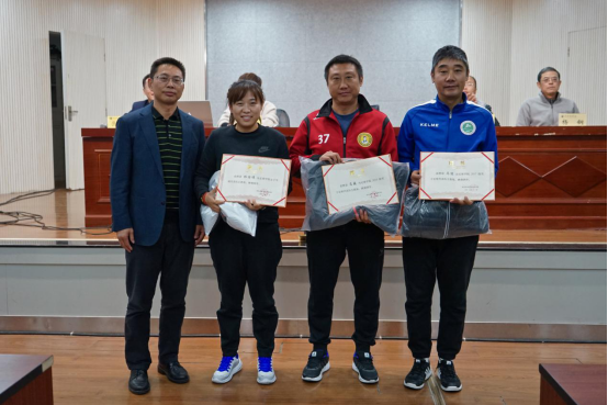 足球学院院长朱军为足球学院2017级男足主教练马俊、2018级男足主教练高巍、足球学院女足主教练林佶倩颁发了聘书,聘期为两年。