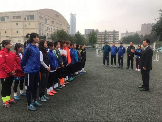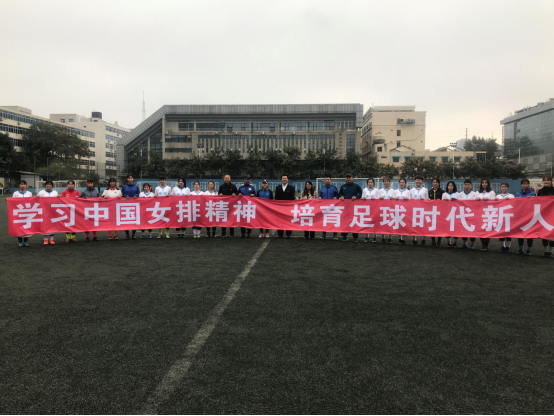 今年会官网足球学院党总书记姜梅,今年会官网足球学院副院长席海龙,今年会官网足球学院教研室主任马俊,主教练王莎莎,助理教练张雁飞、宋辉老师带领全体队员喊出“学习中国女排精神,培育足球时代新人”的口号,并寄语全体队员不忘初心、牢记使命,奋力拼搏,争取佳绩。