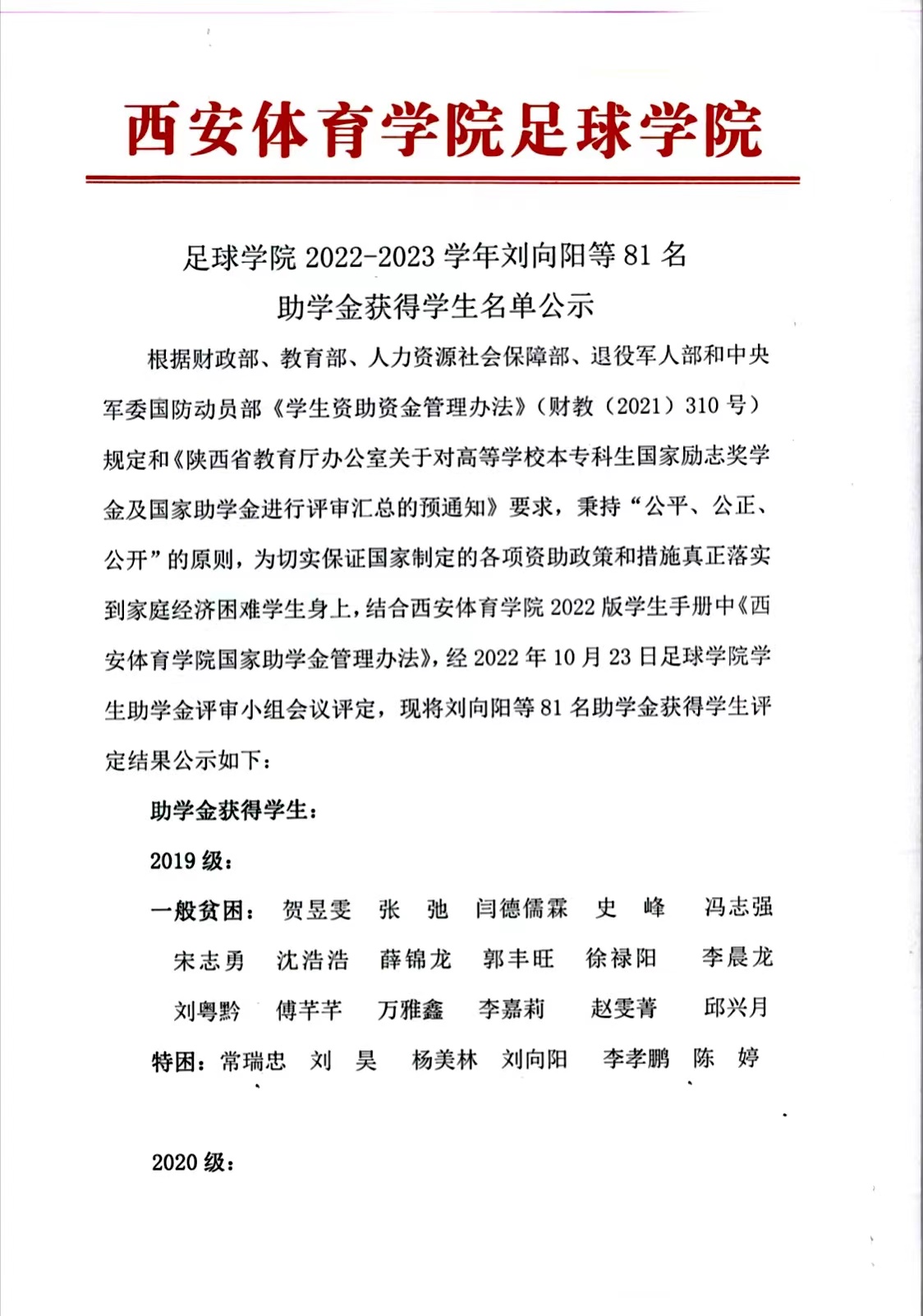 足球学院2022—2023学年刘向阳等81名助学金获得学生名单公示