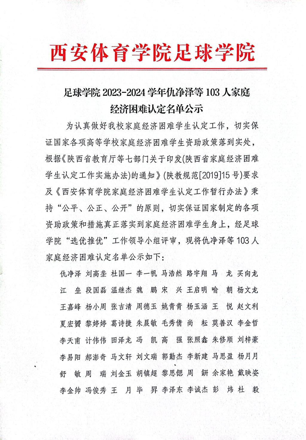 足球学院2023-2024学年仇净泽等103人家庭经济困难认定名单公示