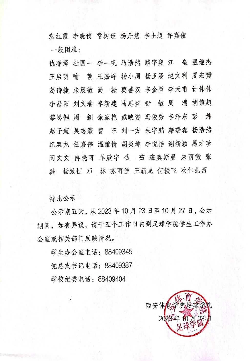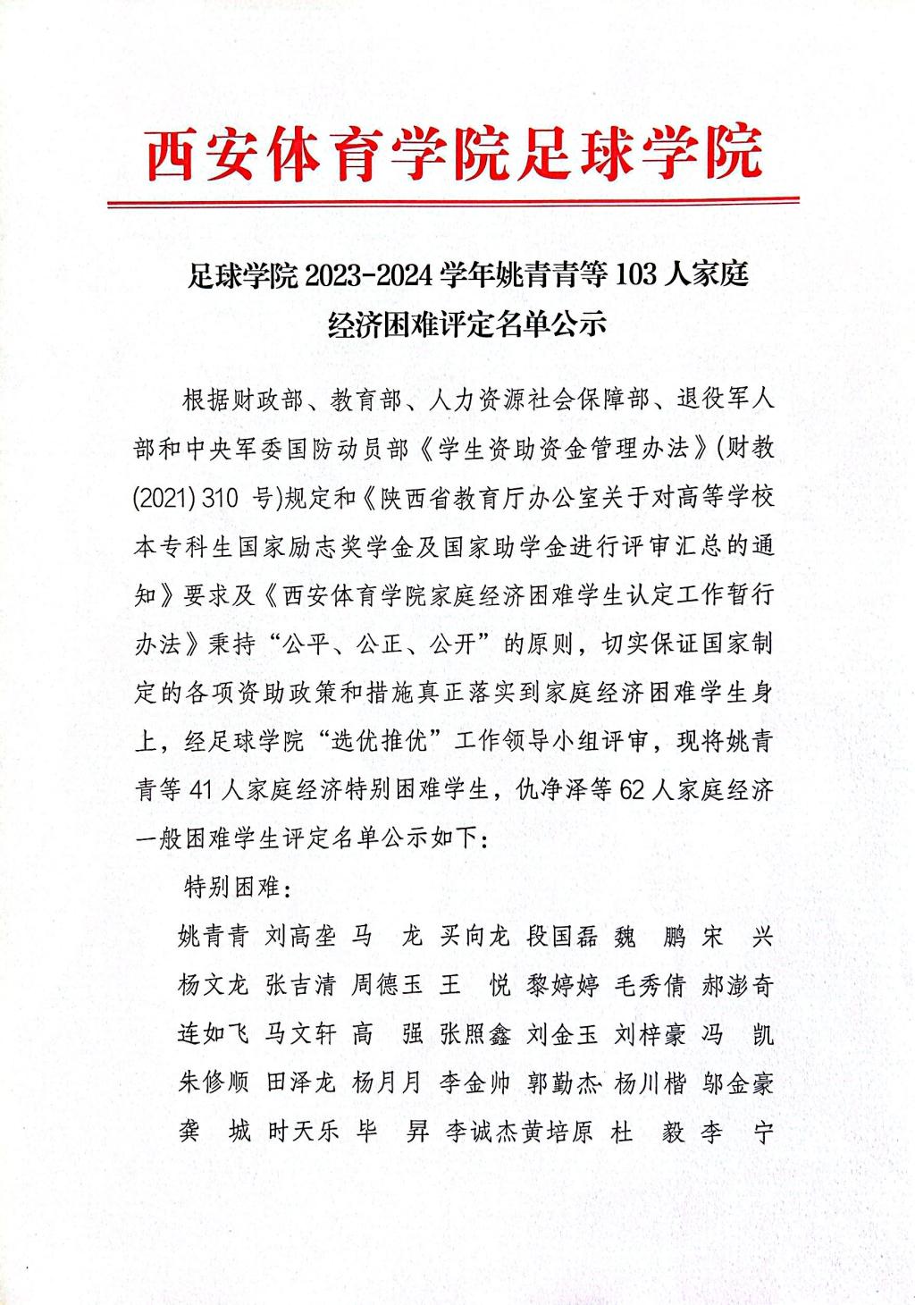 足球学院2023-2024学年姚青青等103人家庭经济困难评定名单公示