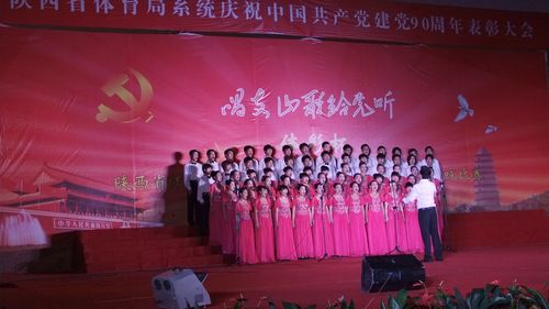 6月28日下午,由陕西省体育局主办的庆祝建党九十周年“唱支山歌给党听”红歌演唱会在丈八训练基地网球训练中心进行,我院艺术系师生演唱的《保卫黄河》和《在灿烂阳光下》两首歌,技压群芳,征服了在场的评委和观众,荣获歌咏比赛唯一的一等奖,展现了我院师生健康向上、朝气蓬勃的精神风貌。 在演唱比赛前召开的陕西省体育局系统庆祝中国共产党建党90周年表彰大会上,我院现年99岁高龄的郭洁教授荣获“世纪十佳人物”荣誉称号;我院1954年建院成为“世纪十佳体育历史事件”。