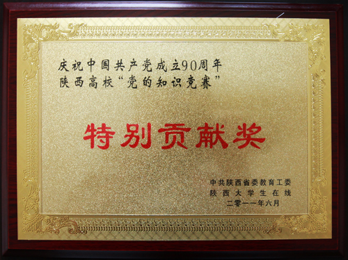 6月29日,陕西高校庆祝中国共产党成立90周年“党的知识竞赛”现场赛决赛在西北大学长安校区落幕。赛后举行了隆重的颁奖仪式,陕西省委教育工委相关领导为获奖高校颁奖,我院被授予特殊贡献奖。