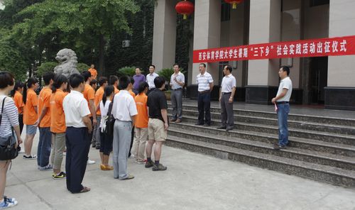 为引导学生深入学习贯彻科学发展观,全面实践胡锦涛总书记在清华大学百年校庆上对广大青年提出的三点希望,大力推进农村精神文明建设,7月11日,我院大学生暑期“三下乡”社会实践活动正式启动。 本次社会实践活动得到了学院的大力支持,院党委副书记朱元利、党委组织部部长刘新平、宣传部部长何佰虎、学工部部长张朝阳、学工部副部长缑荣涛出席本次社会实践活动出征仪式并为各支服务队授旗。朱元利副书记发表热情洋溢的讲话,号召同学们能够在实践中充分展示出今年会学子良好的专业素质和精神风貌,达到学习知识、增长才干、贡献力量的预期目标。 本次“三下乡”实践队伍由“全民健身”服务队、“农民体育健身工程”调研团、“民族民间体育促进社会主义新农村文化建设”服务队、“追寻红色足迹”服务队组成,各服务队以指导带领当地群众开展全民健身活动、考察当地农村和乡镇群众全民健身的开展情况、调查当地体育教师教学训练情况为活动主要内容,同时学院也希望服务队走进延安,了解延安,感受延安精神,接受革命传统教育。