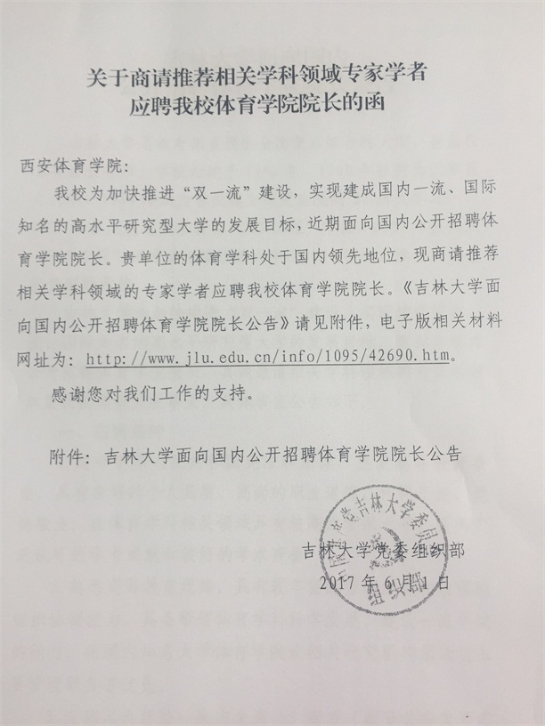 近日,学院收到吉林大学党委组织部发来的关于商请推荐相关学科领域专家学者应聘该校体育学院院长的函件(附招聘公告),现将此函件及招聘公告转发学院相关系、部,请各系部将函件有关精神传达至部门相关人员做好应聘报名工作。