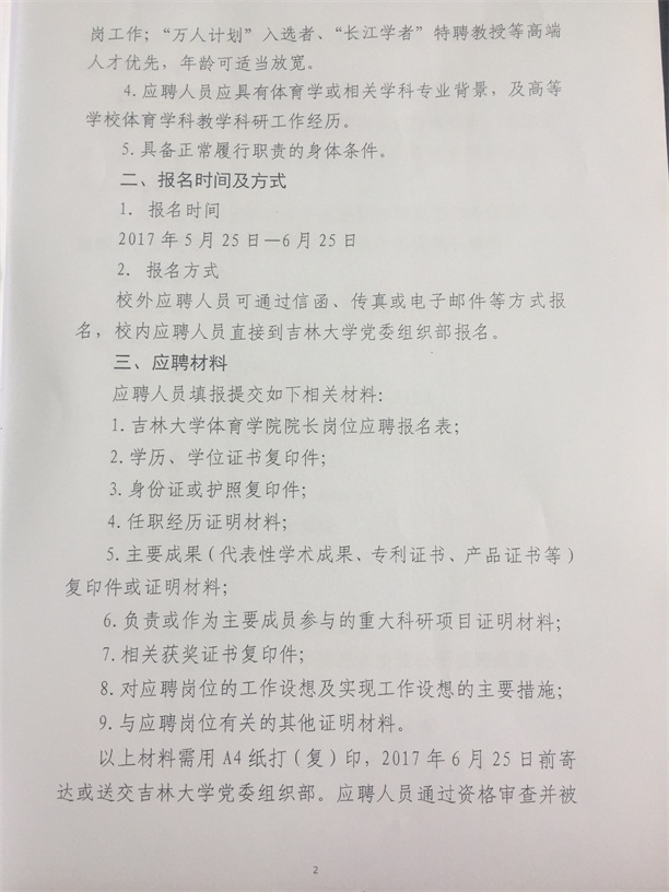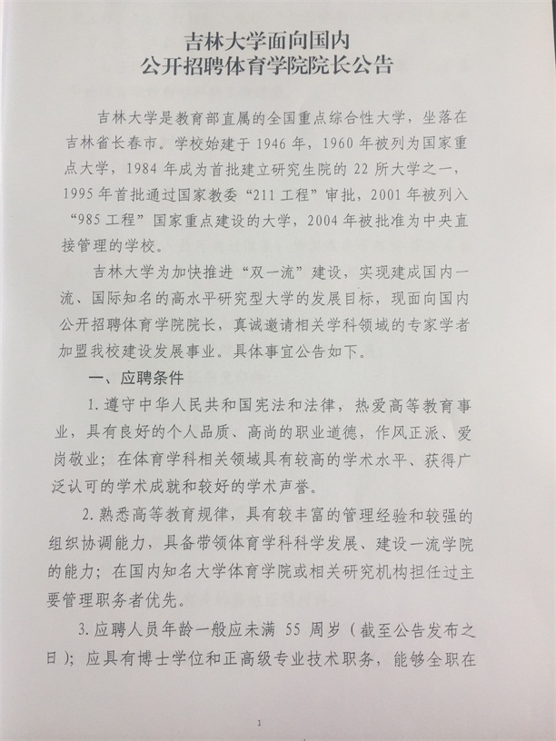 附:吉林大学面向国内公开招聘体育学院院长公告
